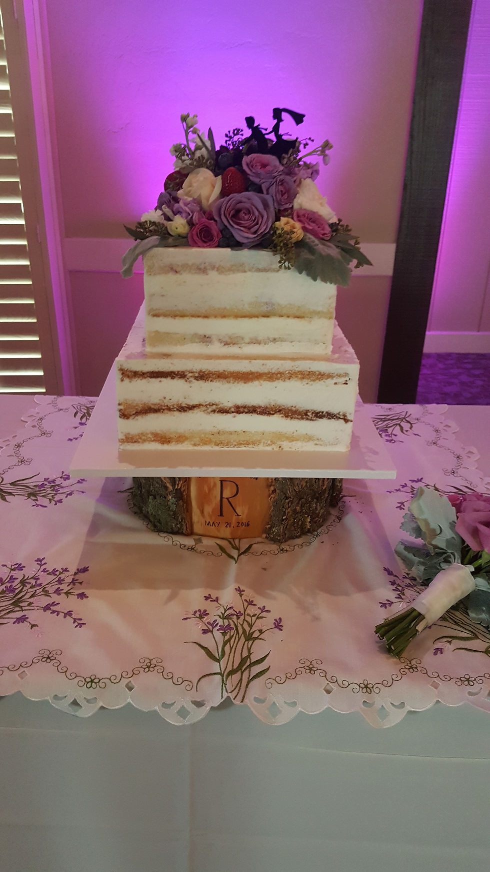 The wedding cake was beautiful. They used a stump from a tree as a cake stand engraved with the date and their initials. It was beautiful!